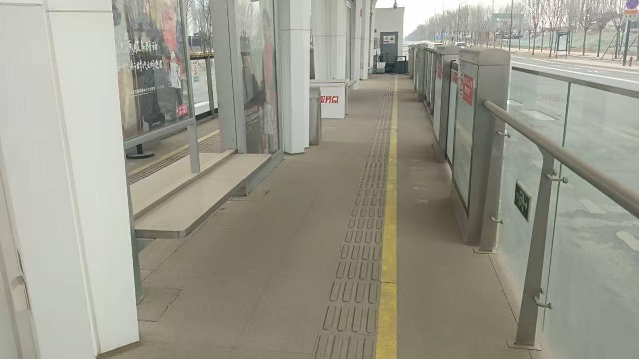 2月9日上午,一位当地市民来到智轨斗门站。灰尘比1月积得更深了,站台一侧已拉起围栏,路上的虚拟轨道有部分也已呈现磨损状态,“坑坑洼洼的”。