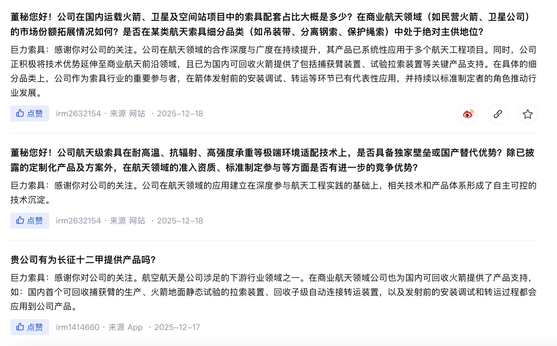 例如,2025年12月17日及18日,巨力索具在深交所互动易接连表示,“在商业航天领域公司也为国内可回收火箭提供了产品支持,如:国内首个可回收捕获臂的生产、火箭地面静态试验的拉索装置、回收子级自动连接转运装置,以及发射前的安装调试和转运过程都会应用到公司产品。”“公司在航天领域的应用建立在深度参与航天工程实践的基础上,相关技术和产品体系形成了自主可控的技术沉淀。”