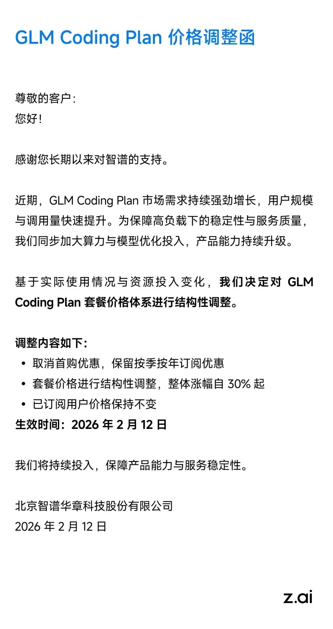 同时,智谱发布GLM Coding Plan价格调整函:基于实际使用情况与资源投入变化,公司决定对GLM Coding Plan套餐价格体系进行结构性调整。调整内容如下:取消首购优惠,保留按季按年订阅优惠;套餐价格进行结构性调整,整体涨幅自30%起;已订阅用户价格保持不变。生效时间:2026年2月12日。