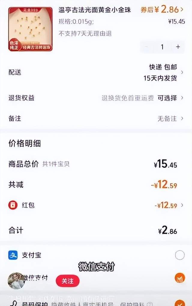 有网友表示,自己在购物平台通过叠加视频红包、蹲守直播间,可以以个位数的低价购入最少0.01克金珠。