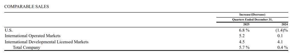 管理层还在电话会上预测,计划今年新增约2600家餐厅,其中美国及国际经营市场约750家,国际发展许可市场超1800家,含中国约1000家;预计净新增2100家餐厅,实现4.5%的门店增长率,2027年全球门店目标维持5万家。