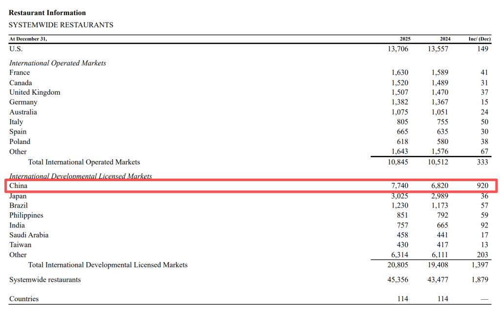 国际发展许可市场方面,去年第四季度同店销售额同比增长4.5%。财报指出,日本的同店销售额增长最为显著,所有地区该数据均实现增长。中国市场方面,管理层在电话会上指出,中国市场尽管面临宏观经济压力,但仍保持市场份额稳定。2025年新增超1000家餐厅,实现全国各省全覆盖。