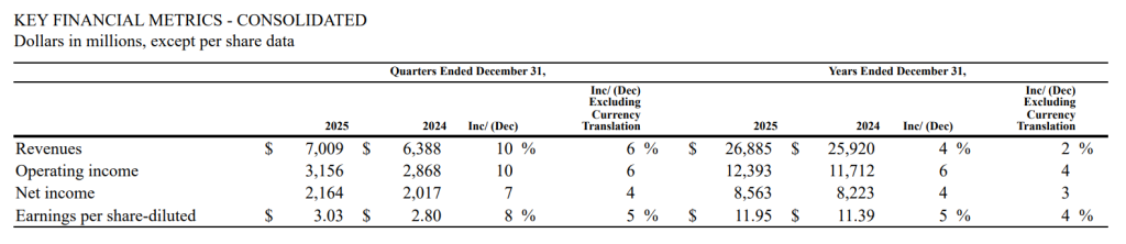 当地时间2月11日,全球连锁快餐巨头麦当劳(MCD:US)公布了截至2025年12月31日的第四季度及2025年年度业绩。财报显示,麦当劳去年第四季度实现营业收入70.09亿美元,同比增长(以下均为不考虑汇率影响下的同比数据)6%,超出市场预期;实现净利润21.64亿美元,同比增长4%。去年全年实现营业收入268.85亿美元,同比增长2%;实现净利润85.63亿美元,同比增长3%。