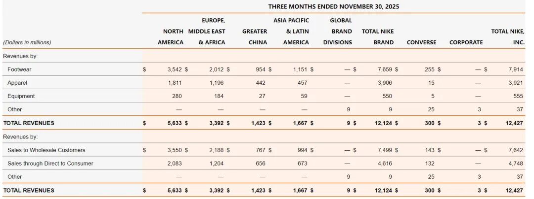 再分品牌来看,同期耐克主品牌实现营收121亿美元,同比增长1%,也主要受北美地区增长带动。彼时的财报也表明,主品牌在北美市场的增长,部分被大中华区和APLA地区的下滑所抵消。
