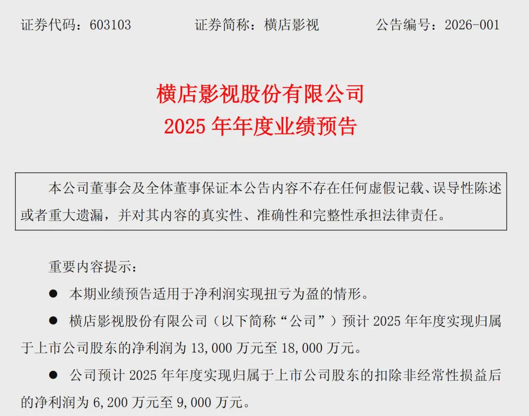 1月31日,横店影视发布业绩预告,预计2025年年度净利润为13,000万元至18,000万元,同比扭亏为盈,扣非后净利润为6,200万元至9,000万元。