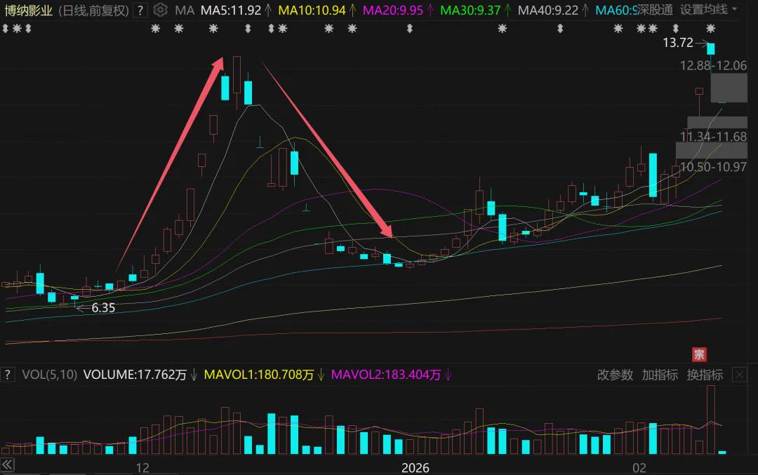 2月9日、10日,博纳影业连续涨停,11日大涨7%以上,12日就跌停。