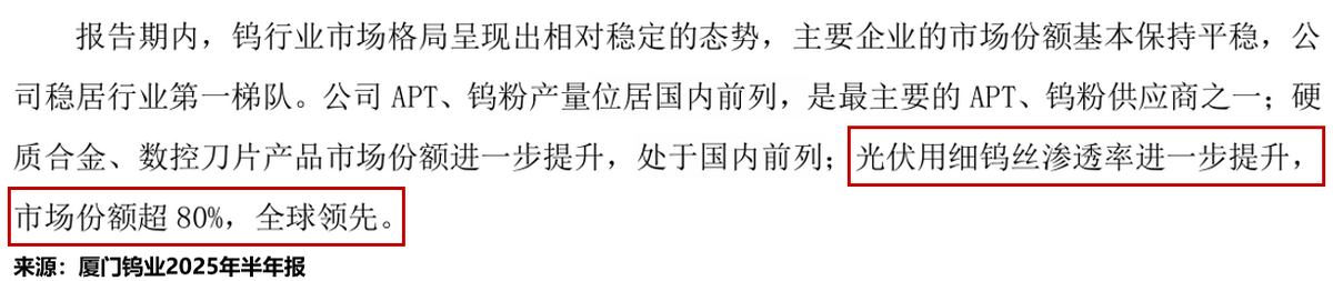 2025年上半年,公司光伏用细钨丝渗透率进一步提升,市场份额超80%,稳居全球第一。