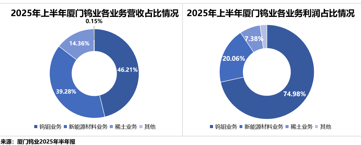 从营收与利润结构来看,钨钼业务是公司的绝对支柱。2025年上半年,公司钨钼业务实现营收88.63亿元,占总营收的46.21%;实现利润总额12.68亿元,占总利润的74.98%。