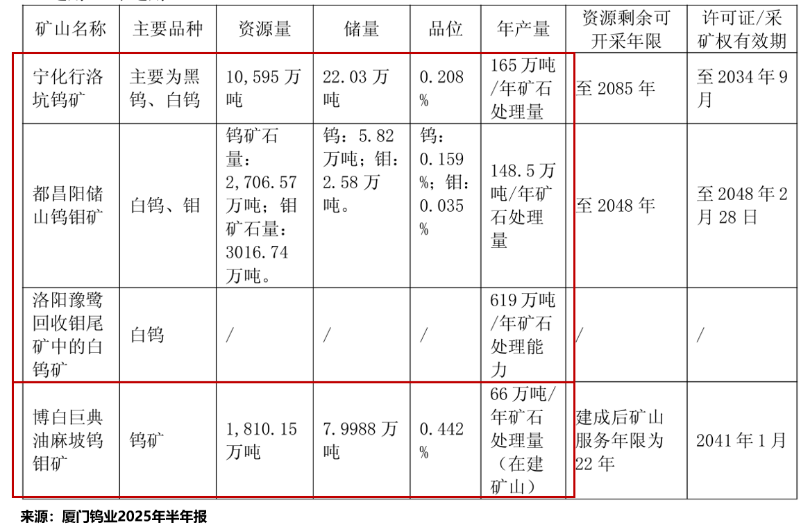 截至2024年末,公司拥有三座在产钨矿和一座在建钨矿,拥有钨矿资源量约1.51亿吨,钨(金属)资源储量约35.85万吨。