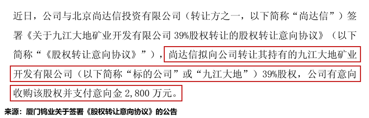 2月9日,厦门钨业发布公告称,公司拟收购尚达信持有的九江大地39%股权,并支付意向金2800万元。