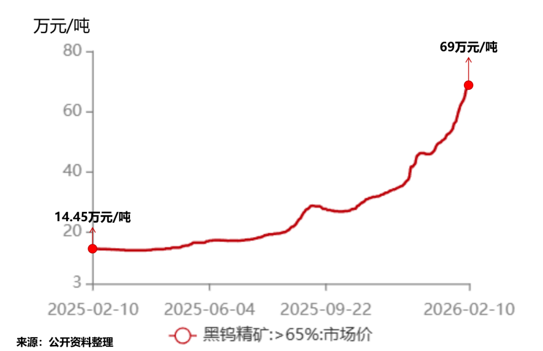 就在厦门钨业资源自给诉求空前迫切之际,钨价开启了新一轮上涨。2025年以来,钨价持续上涨并维持在高位。截至2月10日,黑钨精矿(>65%)市场价格高达69万元/吨。