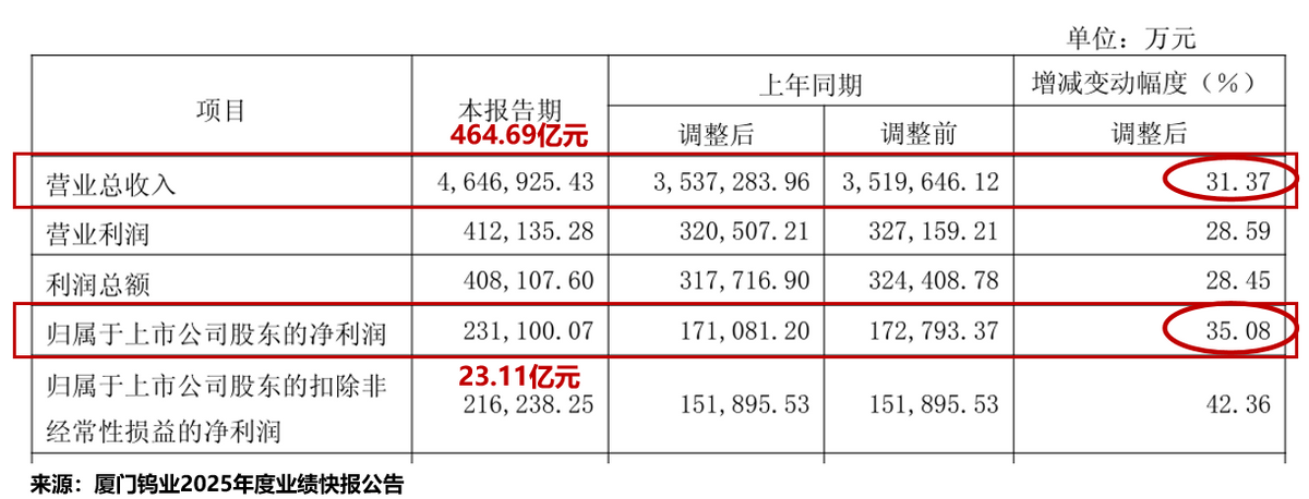 根据厦门钨业2025年度业绩快报公告,2025年,公司实现营收464.69亿元,同比增长31.37%;实现净利润23.11亿元,同比增长35.08%。