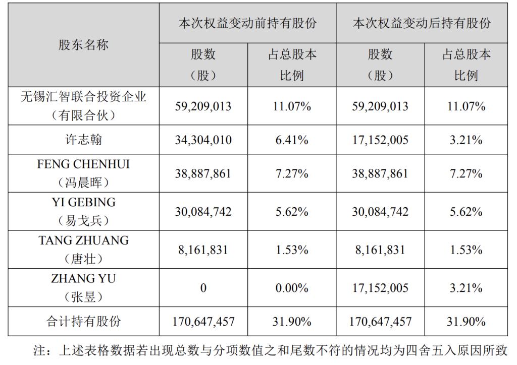 本次权益变动后,许志翰直接持有公司无限售条件流通股份17152005股,占公司总股本的3.21%;张昱直接持有公司无限售条件流通股份17152005股,占公司总股本的3.21%。