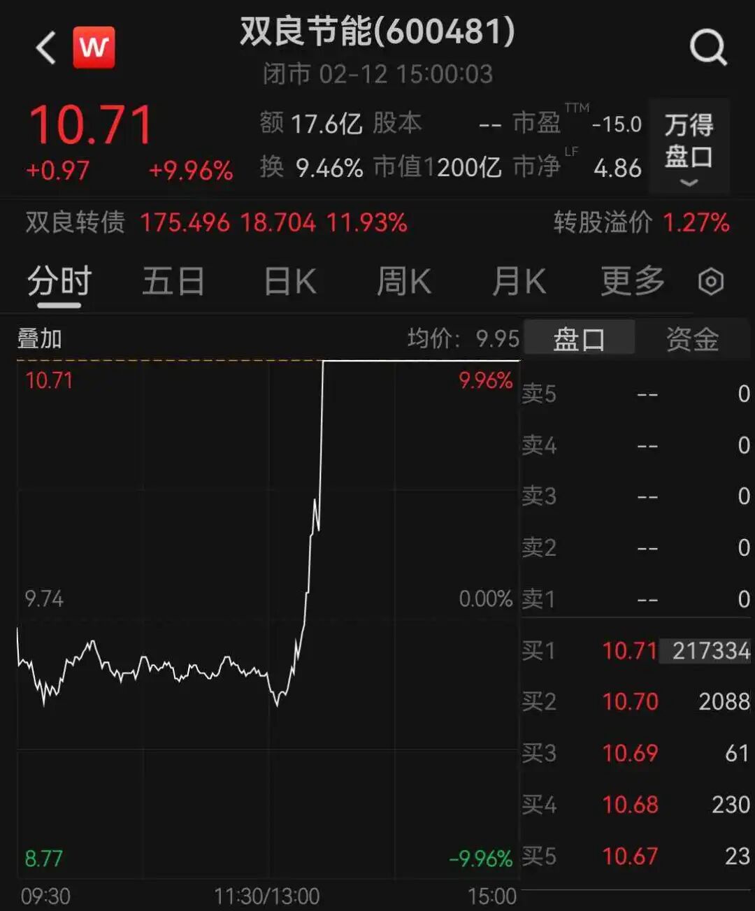 二级市场上,双良节能今日午后股价突然直线拉升涨停,截至收盘,报10.71元,成交额超17亿元。