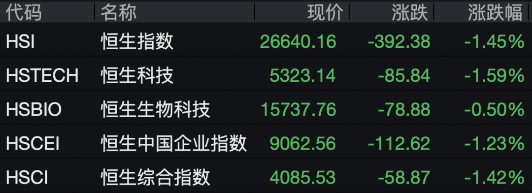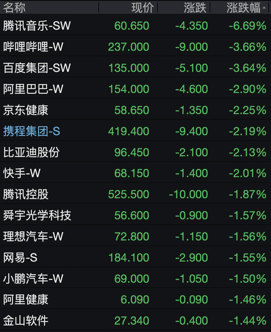 大型科网股全线走低,腾讯音乐跌逾6%,哔哩哔哩、 百度集团跌逾3%,阿里巴巴、携程集团、快手跌超2%,腾讯控股、网易、金山软件均走低。
