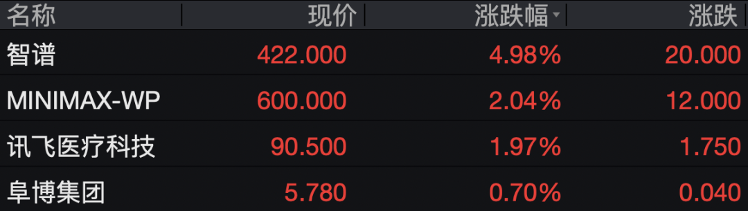 大模型概念股走高,智谱高开4.98%,MINIMAX-WP涨超2%。