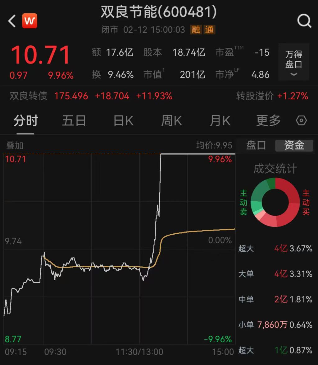 澎湃新闻注意到,上述消息最早在13时02分发布于双良节能母公司双良集团的微信公众号,由此引发双良节能快速直线涨停,最高封单金额达11亿元,当天成交金额达17.62亿元。