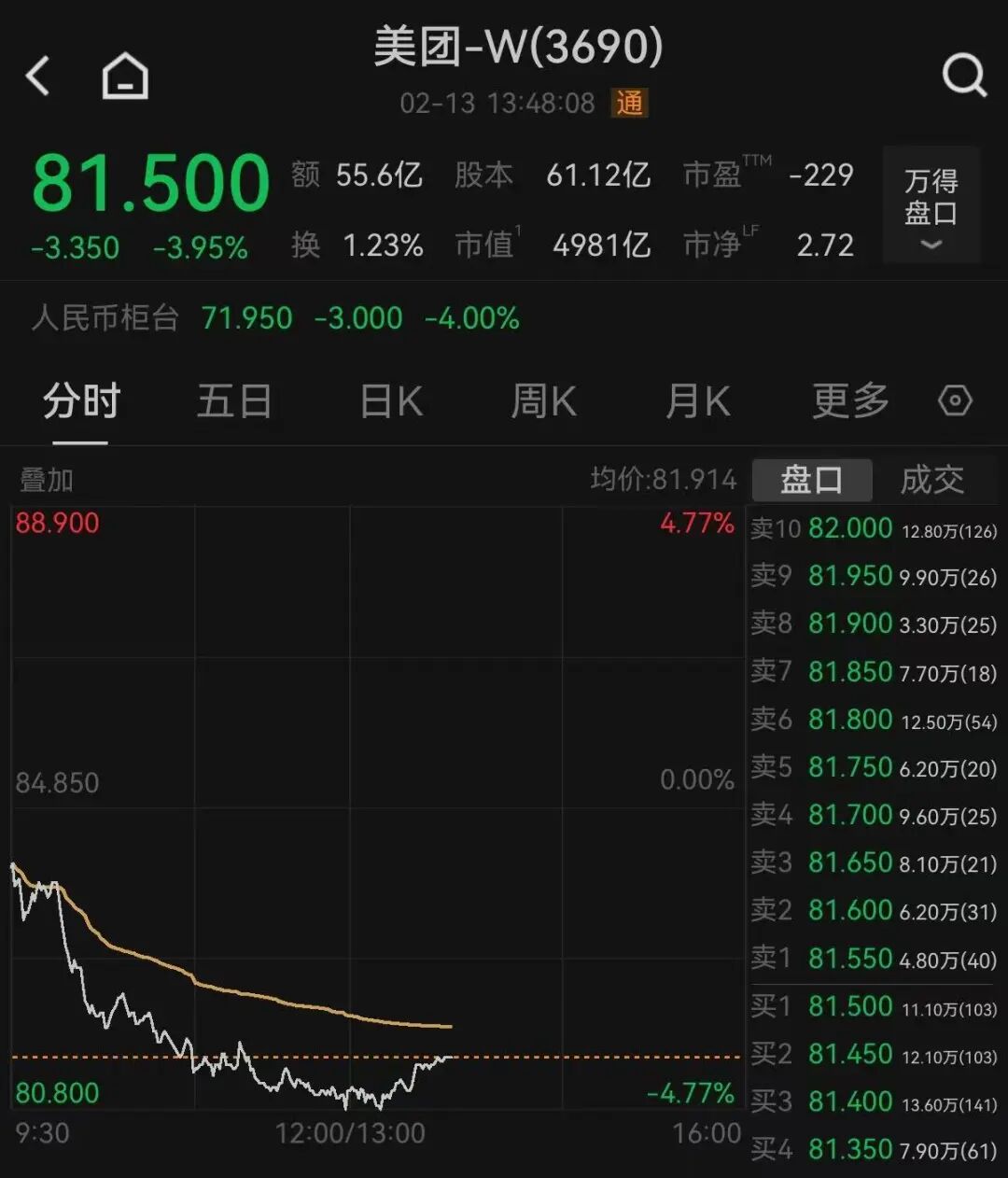 2月13日,美团股价持续下跌,盘中一度跌超4.5%,截至发稿,股价报81.5港元,市值为4981亿港元,跌破5000亿港元。