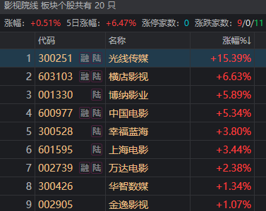 值得注意的是,午后影视院线一度急速拉升,板块指数从跌0.63%一度涨超2.6%,后续震荡回落。