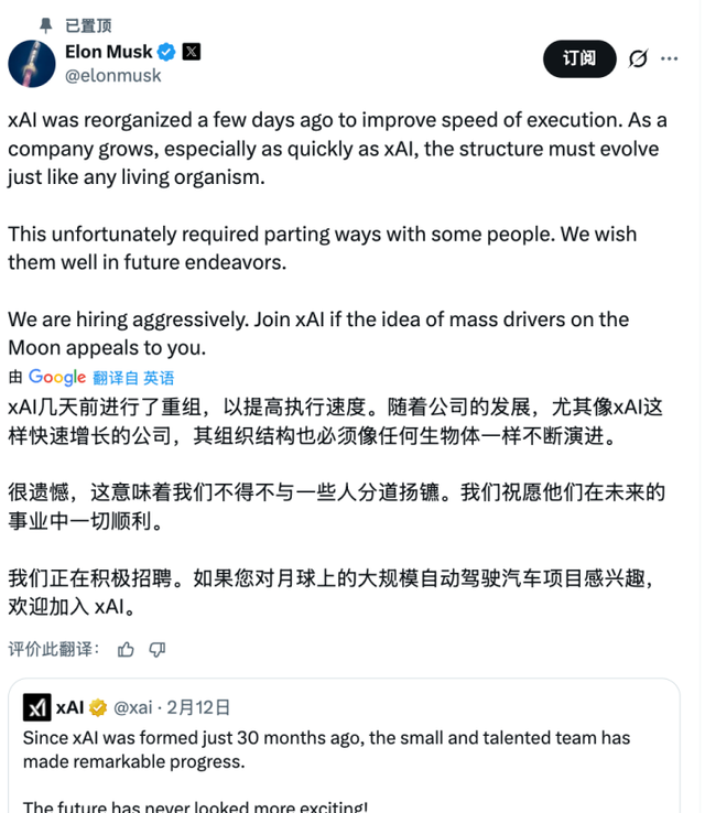“xAI几天前进行了重组,以提高执行速度。随着公司的发展,尤其是像xAI这样快速增长的公司,其组织结构也必须像任何生物体一样不断演进。