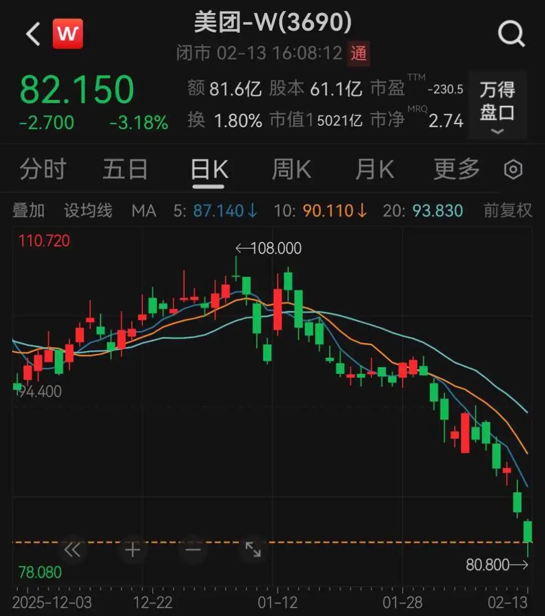 二级市场上,美团今日盘中一度跌超4%,市值跌破5000亿港元。截至收盘,跌3.18%,总市值5021亿港元。
