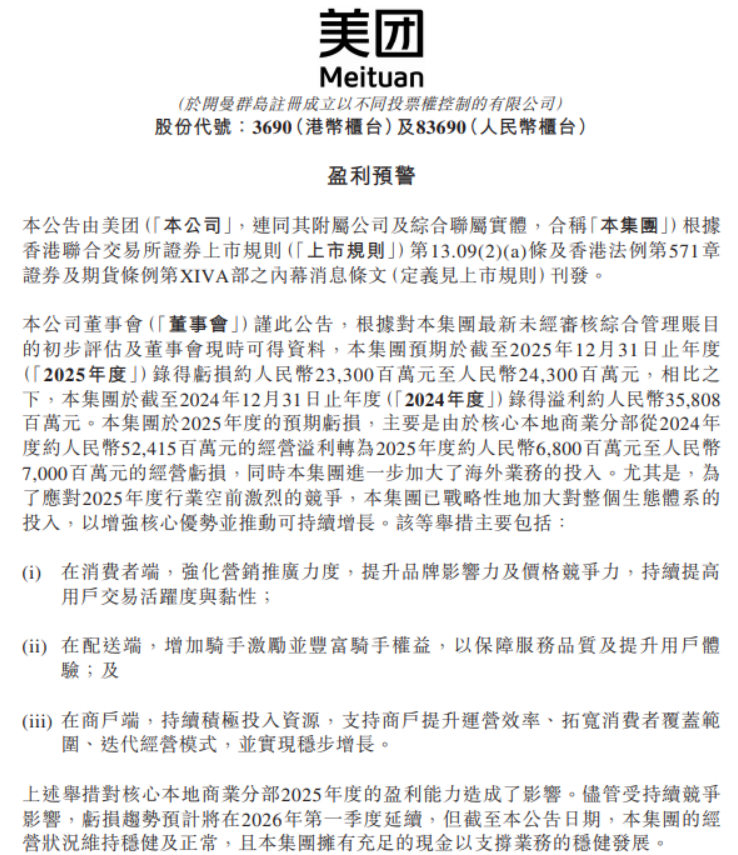 美团表示,2025年度预期亏损主要是由于核心本地商业分部从2024年度约人民币52,415百万元的经营溢利转为2025年度约人民币6,800百万元至人民币7,000百万元的经营亏损,同时集团进一步加大了海外业务的投入。