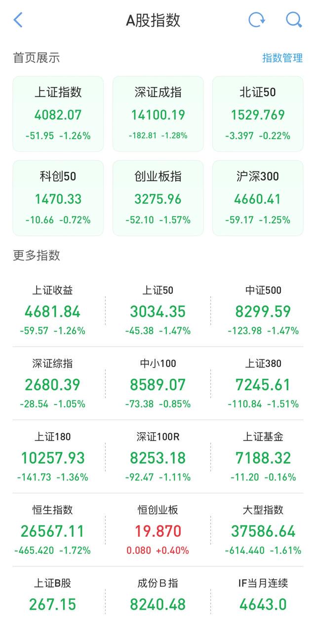 你看上图这个表现,绝大部分指数的跌幅都超过1%,尤其是重要指数,上证跌了1.26%,深成指跌了1.28%,沪深300跌了1.25%,创业板指跌了1.57%,中证A500跌了1.39%,万得全A跌1.13%,万得A500跌1.4%。