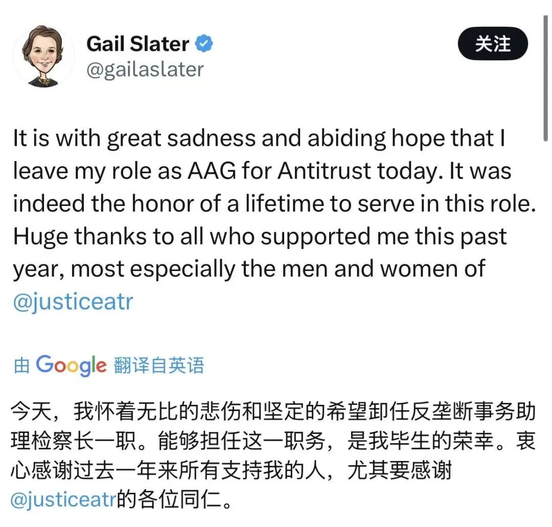 2月13日,美国司法部负责反垄断事务的助理司法部长盖尔·斯莱特在社交平台X上发文称,自己在任仅一年后离开岗位,“深感悲痛”。
