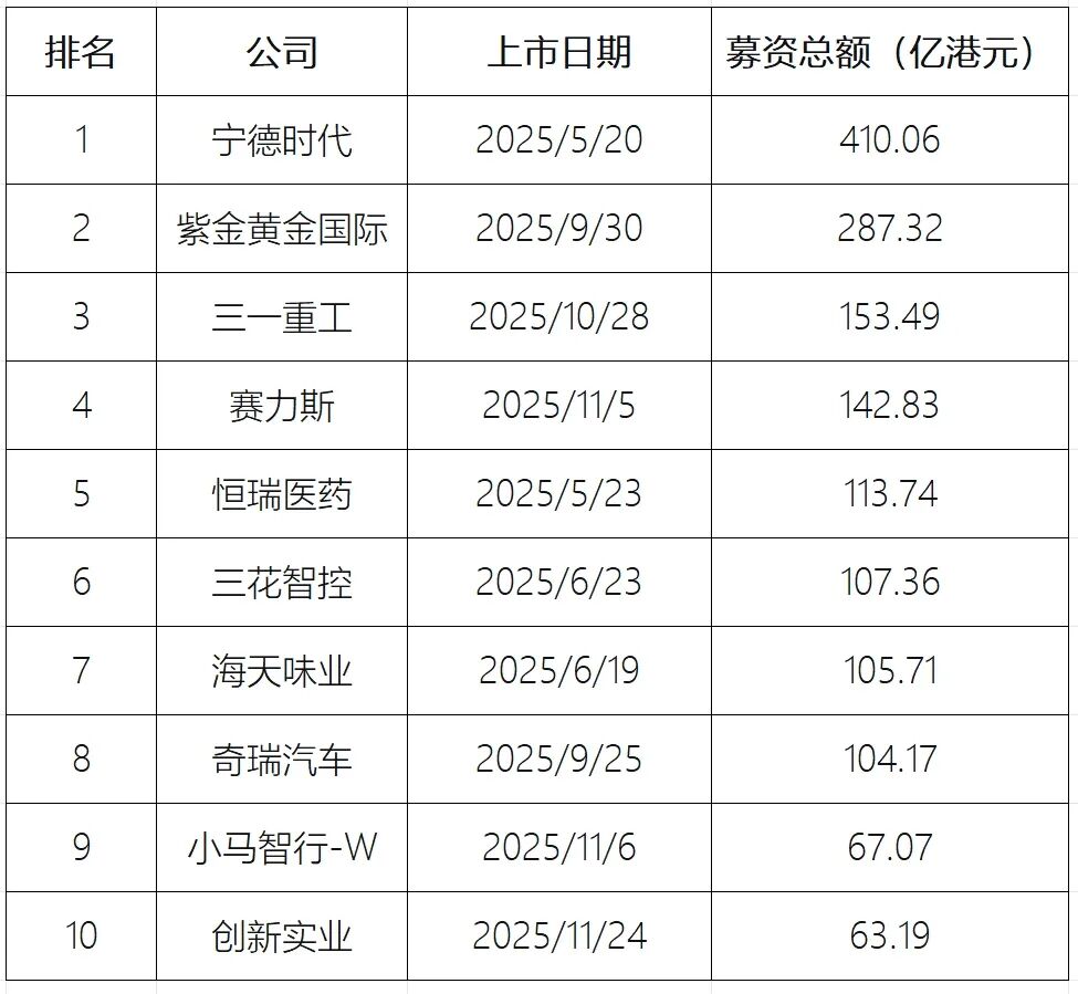 2025年港股上市企业中,募资金额超过百亿港元的共有8家,募资总额约1425亿港元,占全年总额的5成。