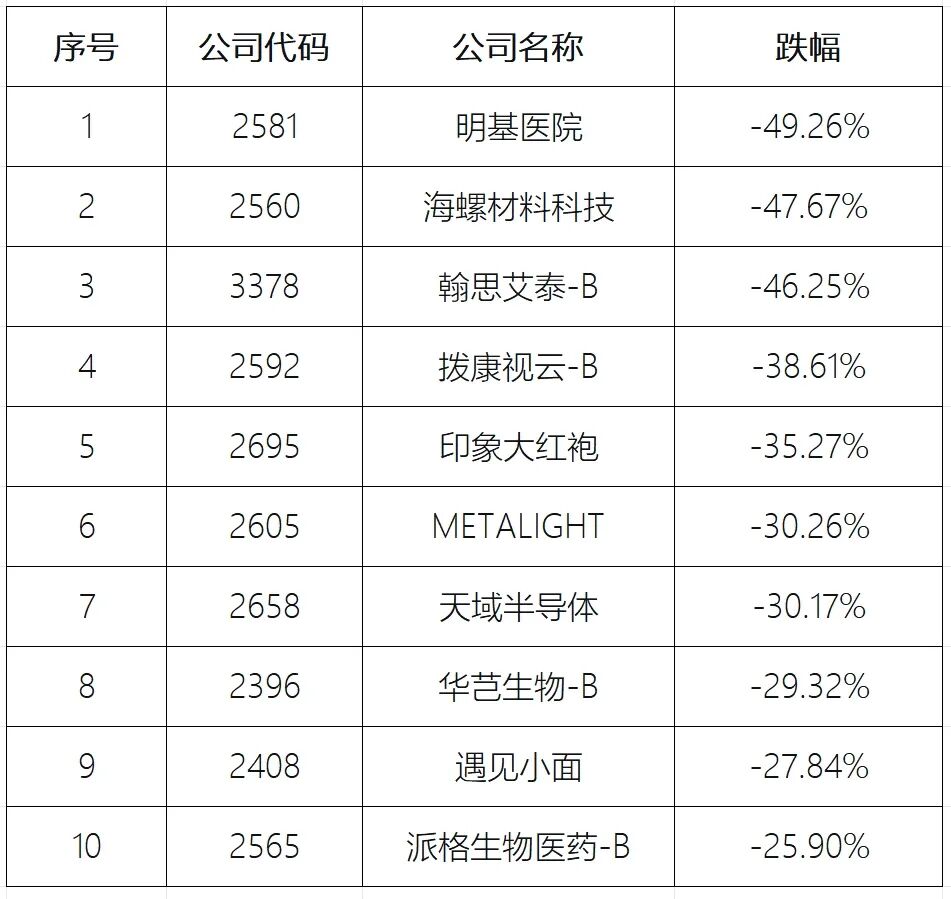 新股中,首日跌幅最大的明基医院,达到了49.26%。海螺材料科技和瀚思艾泰-B以47%上下的跌幅居于二、三名。