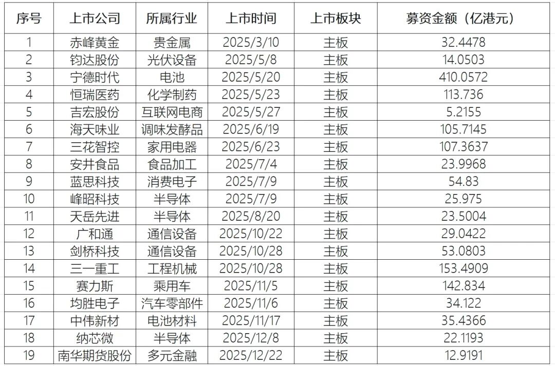 这其中,A股上市公司表现尤其亮眼。数据显示,2025年港股上市企业中,有19家已在A股挂牌,超16%的占比创十年来的新高。它们募资总额超1399亿港元,接近港股全年募资额的半数。