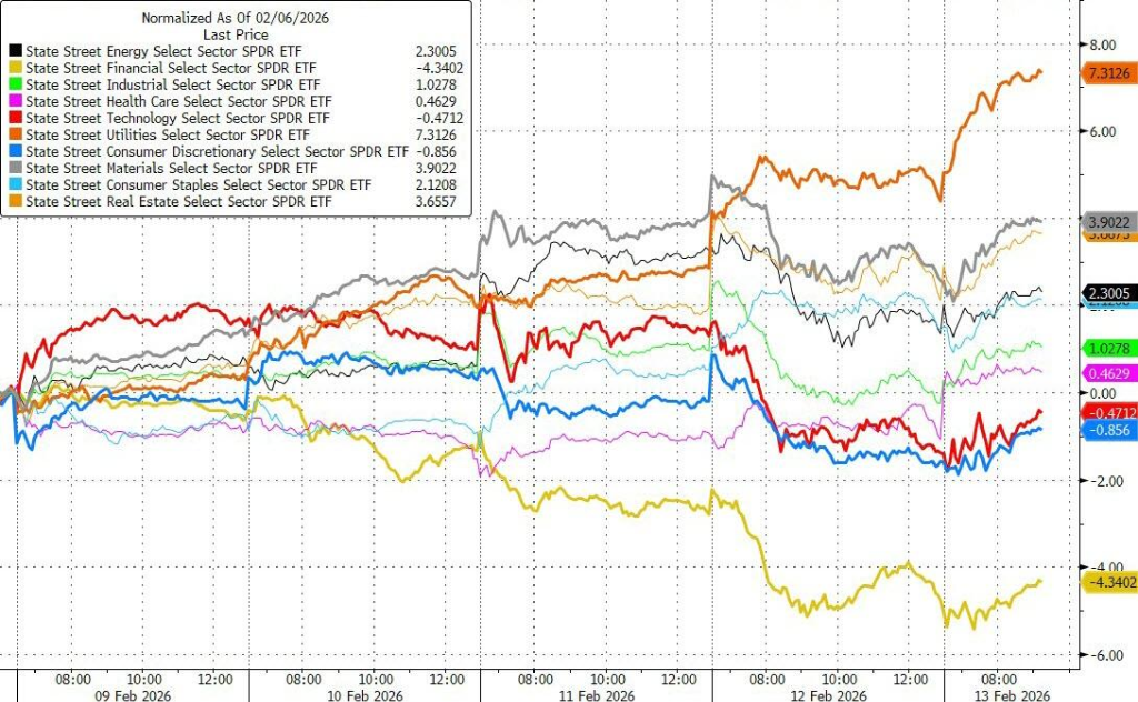 (本周美股公用事业板块作为规避AI冲击的安全港,表现大幅领先,而金融板块则成为当周表现最差的板块)