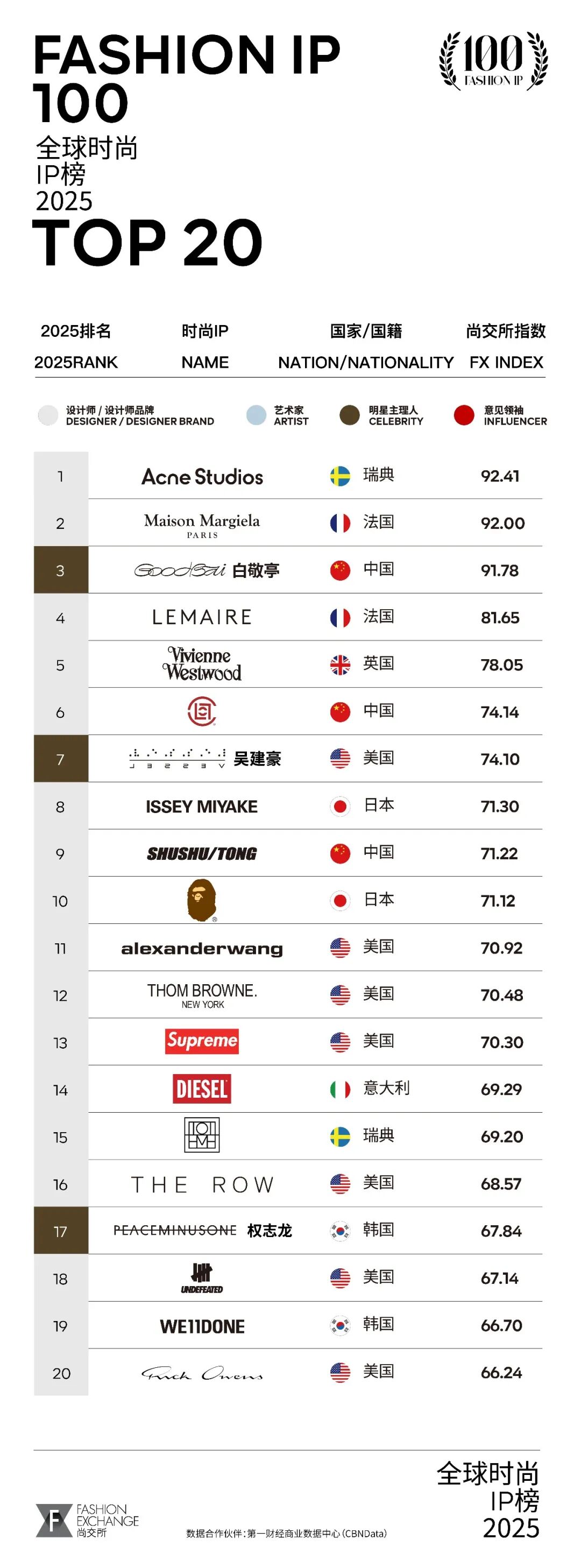 尚交所发布《2025全球时尚IP榜》(FASHION IP 100),这是尚交所自2019年以来与数据合作伙伴——第一财经商业数据中心(CBNData)连续第7年发布该榜单。榜单显示,瑞典品牌Acne Studios首次登顶,成为历史第5个登顶的时尚IP;中国本土时尚IP整体影响力显著提升,共有21个上榜,白敬亭的GoodBai、陈冠希的CLOT重回前十,SHUSHU/TONG首次进入前十,“Labubu之父”龙家升首次上榜。深度解析榜单后可以看出,2025年的中国消费市场已基本完成“符号祛魅”,消费者进一步摒弃“Logo崇拜”,转向追求产品本质、审美与文化价值认同;中国时尚消费正从“流量主场”转向“文化与审美驱动”。