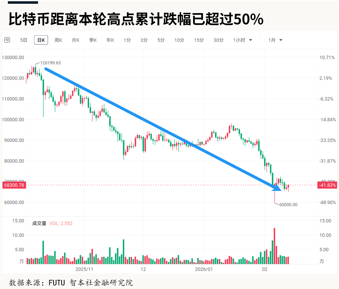 近期,在多重利空因素共振下,全球金融市场正经历一场跨资产抛售潮,比特币首当其冲。其价格一度跌破6万美元关口,较2025年10月创下的历史高点12.6万美元暴跌逾50%以上,创下自2024年10月以来的新低。