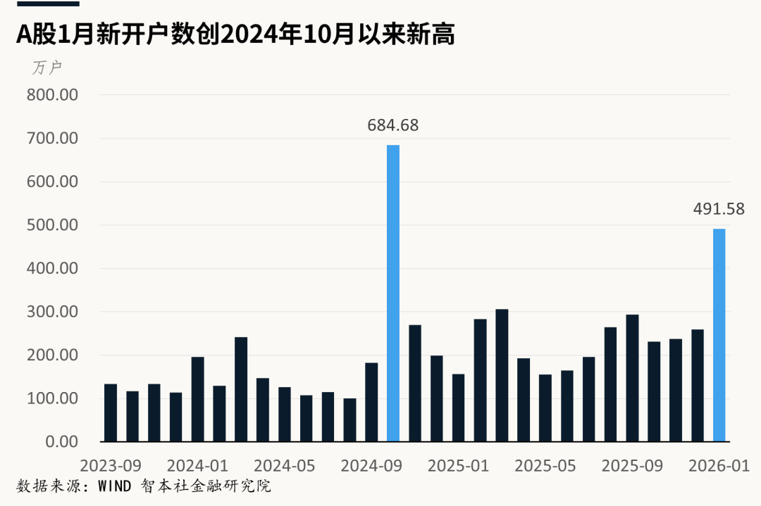 受2026年1月A股市场走势影响,散户入市热情显著升温。智本社的统计显示,当月A股新增开户数达491.58万户,不仅刷新自2024年10月以来的单月纪录,更呈现同比大幅增长约213%、环比提升近九成的走势。