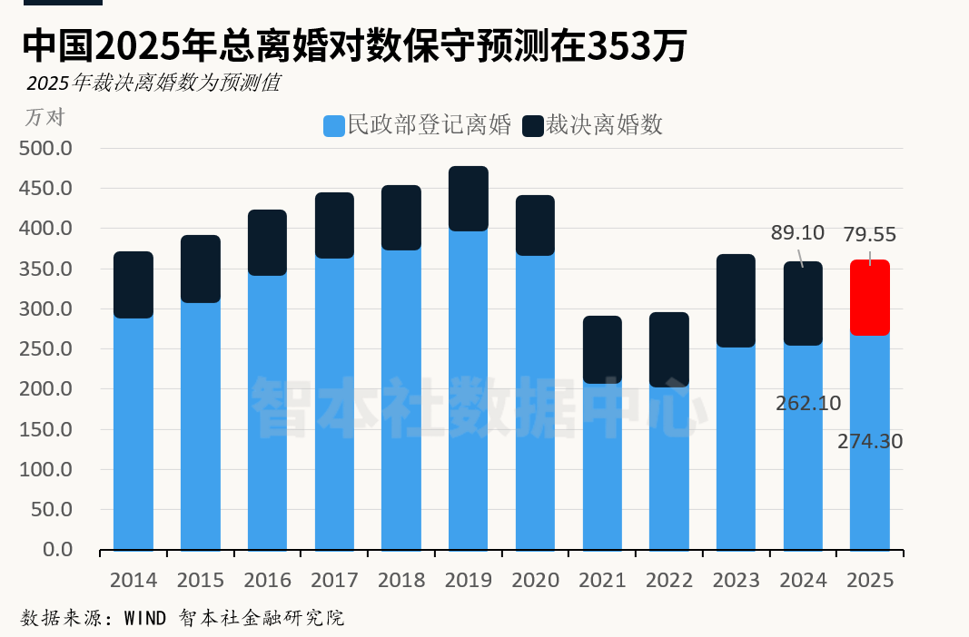 智本社数据中心本周基于历年的数据保守推算:2025年诉讼离婚约在79.6万对,全年总离婚量为274.3万 + 79.6万 = 353.9万对。