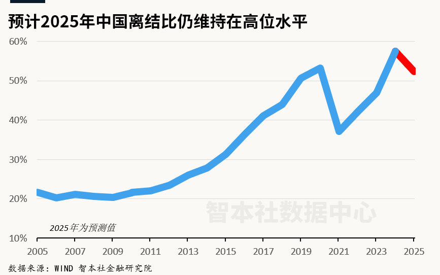 而另外一个数据也值得关注,按照推算数据,2025年离结率高达50%以上,即每100对结婚中约50对离婚,这项数据仍处于历史高位。