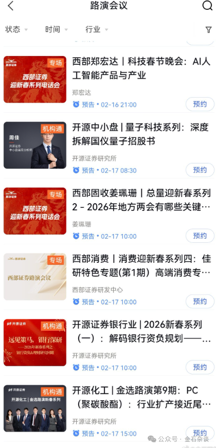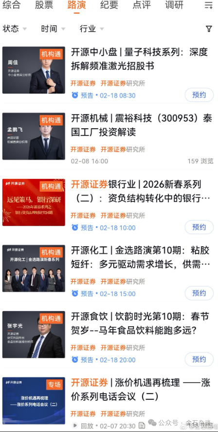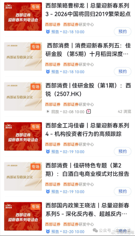根据金石杂谈对某知名路演平台的查询,除夕当晚,西部证券便安排了路演;大年初一清晨,开源证券、西部证券、兴证证券、华福证券等纷纷登场,其中西部和开源各占两场。