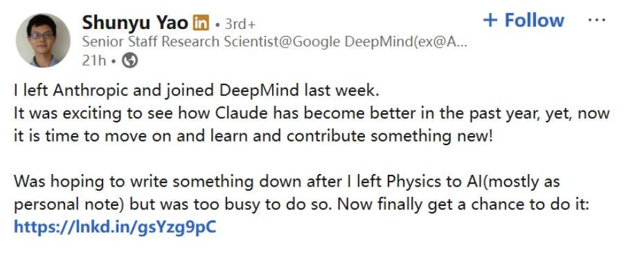 但故事没有在离职中结束。离开Anthropic仅10天后,姚顺宇就加入了Google DeepMind,担任高级研究科学家(Senior Staff Research Scientist),且直接进入核心Gemini团队。