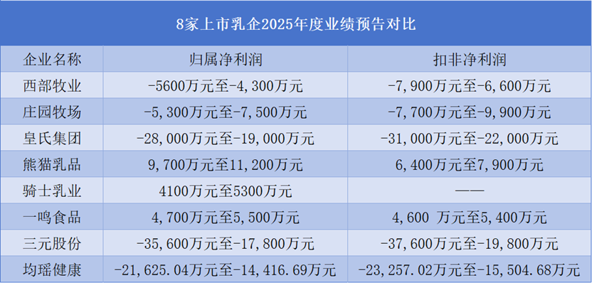多家上市乳企披露2025年度业绩预告,整体业绩保持承压,共有3家实现盈利。其中,均瑶健康面临的挑战更为严峻,预计2025年净利润亏损1.44亿元至2.16亿元,在上市乳企中表现落后。