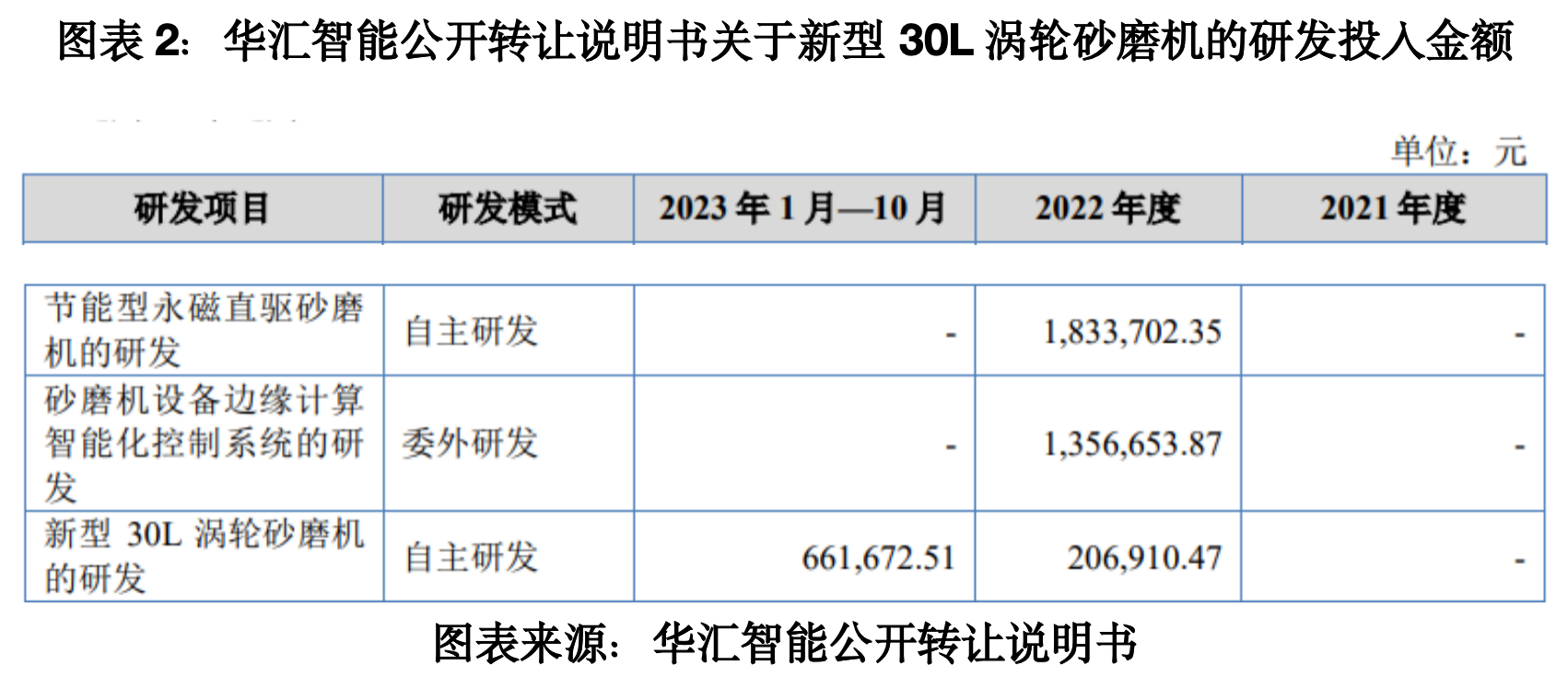 招股书显示,2022—2023年,华汇智能“新型30L涡轮砂磨机”的研发投入金额分别为17.93万元、61.13万元且已结项,且在招股书中,华汇智能表示,报告期内(2022—2025年前三季度),公司研发投入全部计入研发费用,不存在研发支出资本化的情形。