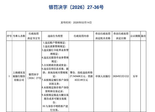 浦发银行被警告并没收违法所得27.545608万元,罚款4222.89万元。