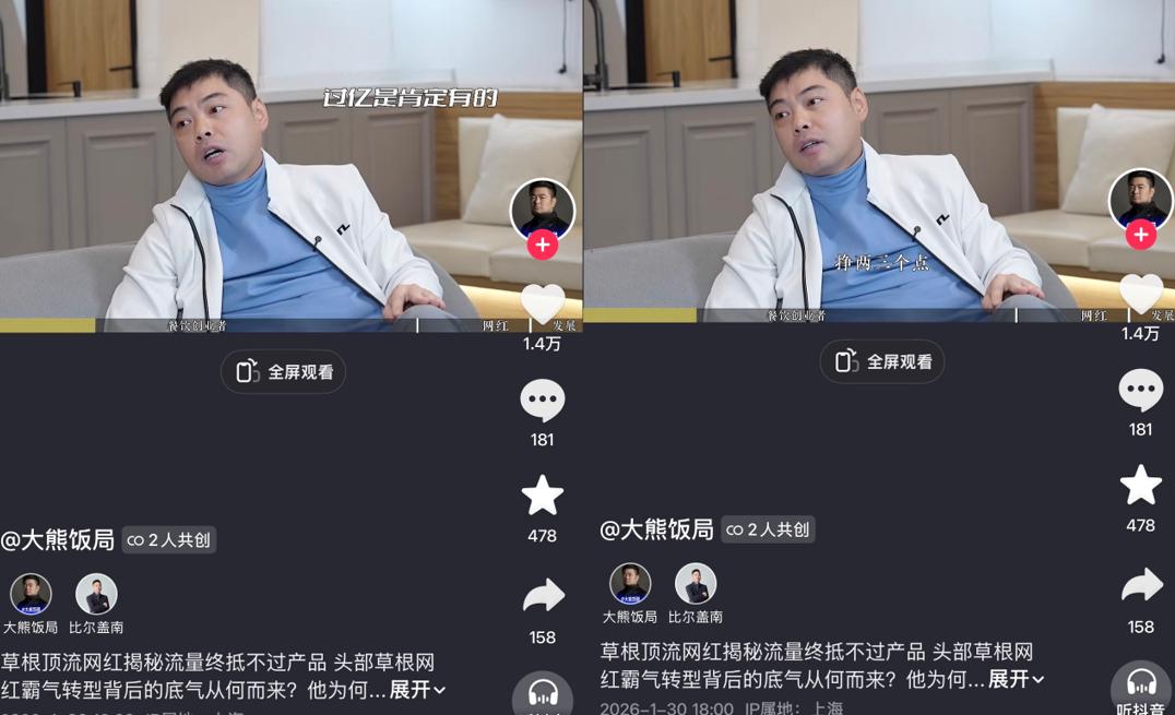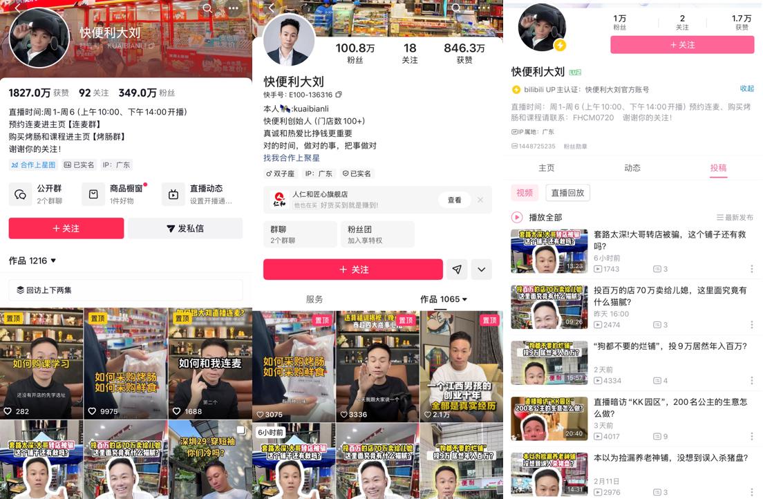 这使连麦直播的相关视频内容,包括各类切片和剪辑,都能获得可观流量。拿勇哥来说,在抖音、快手、B站等平台上,有“勇哥餐饮创业路”“勇哥餐饮原创”“勇哥餐饮避坑指南”等多个专做直播切片的账号,单个热门视频播放量可达300万以上。大刘也有“快便利大刘粉丝”“快便利大刘迷粉”“大刘切片精选”等相关切片账号。