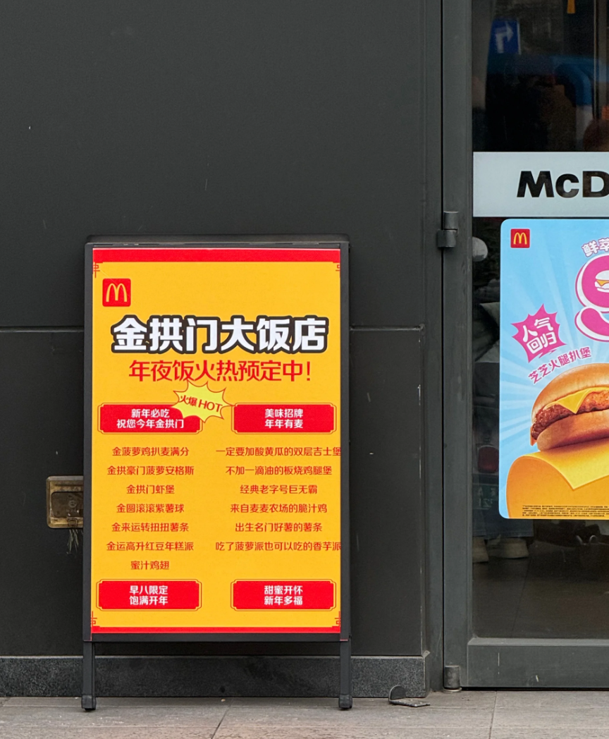 1月底,麦当劳部分城市的餐厅门口摆出了年夜饭菜单,菜单正上方颇为正式地标注着,“金拱门大饭店,年夜饭火热预定中”。