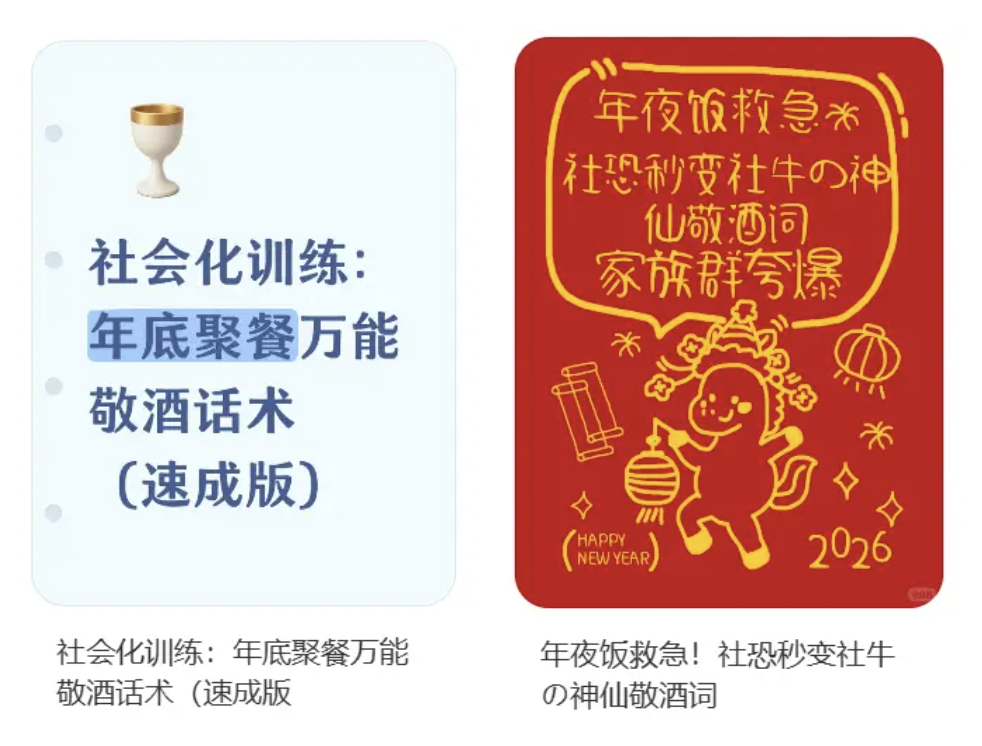 年夜饭同时还代表一种无法被批评或拒绝的文化:在这样的文化下,催婚和问薪资是交流感情的方式,毕竟“一大家子好不容易聚在一起”;年夜饭是酒桌和尊卑文化的集中展现:喝酒、敬酒是一种“习俗”,“小孩”要轮流敬“大人”,拒绝敬酒是“不懂事”的体现。幸好今年,你能在互联网上找到AI总结好的“5个年夜饭敬酒词万能模板”。