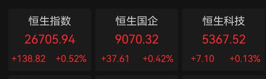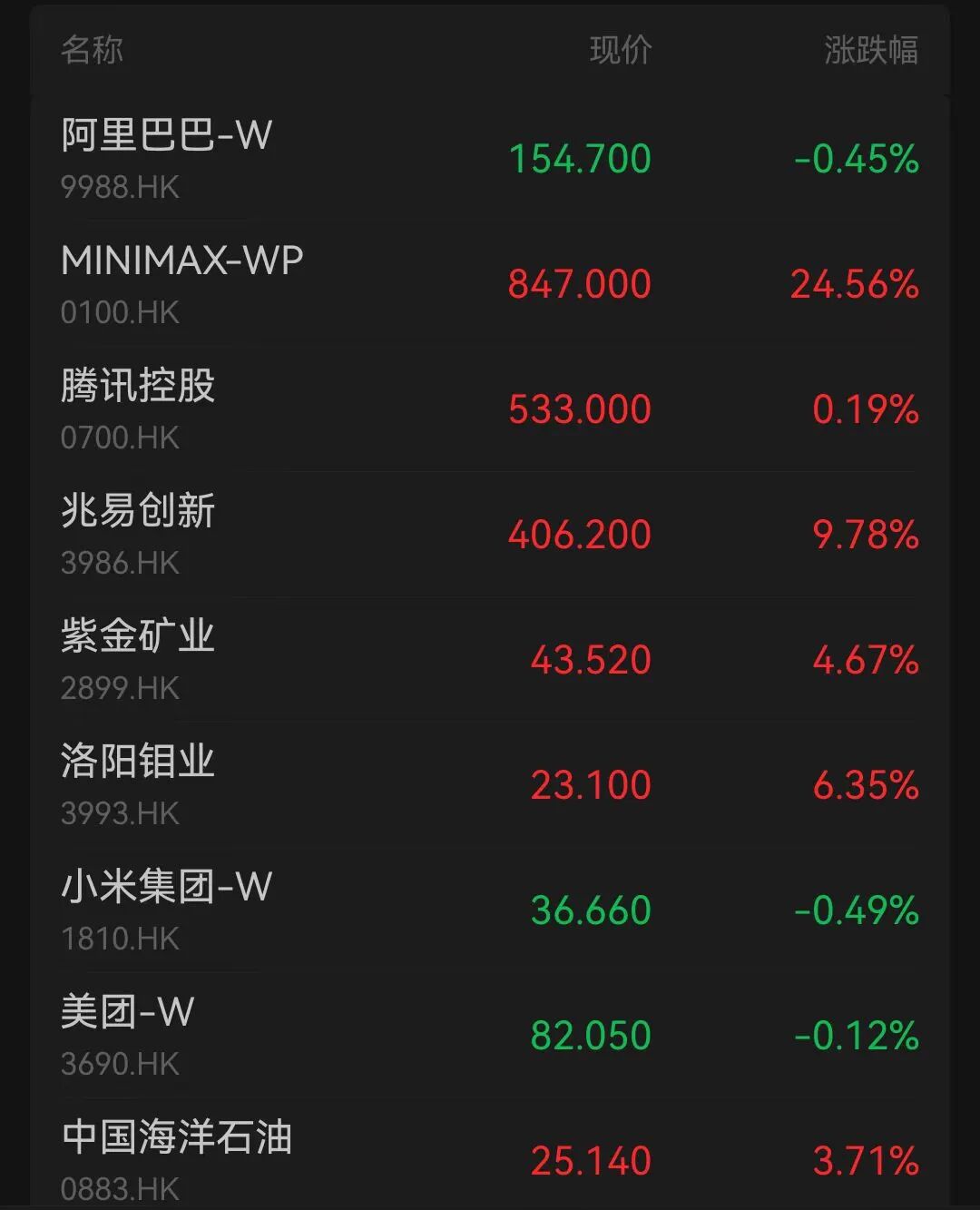 春节前最后一个交易日,港股开市半日。恒指报26723.0点,涨0.59%,恒生科技指数报5367.28点,涨0.13%。AI应用概念大涨,MINMAX-WP涨24%;智谱涨4%;有色金属板块大涨,洛阳钼业涨逾6%。紫金矿业、灵宝黄金涨逾4%。半导体板块走强,澜起科技涨逾14%,兆易创新涨逾9%。