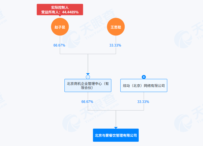 穿透股权来看,王思聪持股33.33%的北京商机企业管理中心(有限合伙)是与雾餐饮公司的大股东,持股比例为66.67%。