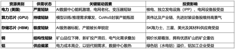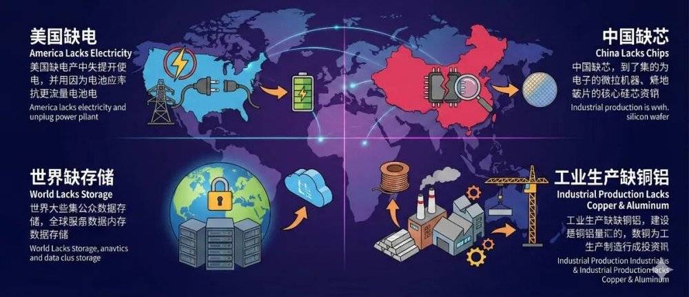 如果说数据是AI时代的石油,那么电力、芯片、存储和基础金属就是AI时代的氧气、引擎和骨架。2026年,全球投资界达成了一个惊人的共识:美国缺电,中国缺芯,世界缺存储,工业生产缺铜铝。制约AI发展的最大瓶颈不再是算法的演进,而是物理世界资源的短缺。这种“虚”与“实”的错配,正在引发大宗商品和基础设施领域的超级周期。