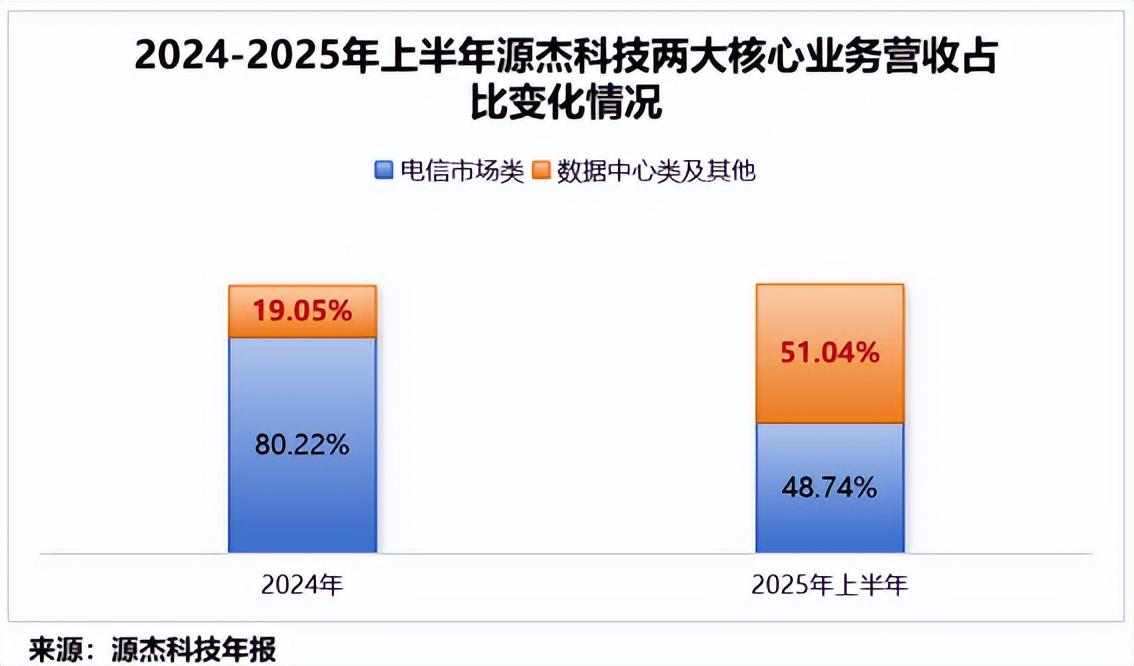 2025年上半年,源杰科技的数据中心类业务收入达到1.05亿元,同比激增1034.18%,营收占比首次超过电信业务。而在2024年,这一占比仅为19.05%。