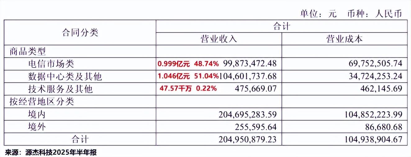2025年上半年,公司电信市场类产品营收占比48.74%;数据中心类产品占51.04%;技术服务类占0.22%。
